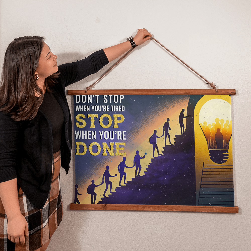 An inspiring wall tapestry framed in natural wood — blending motivation with minimalist design. The perfect piece to uplift your space and remind you to keep moving forward, even when the journey feels long.